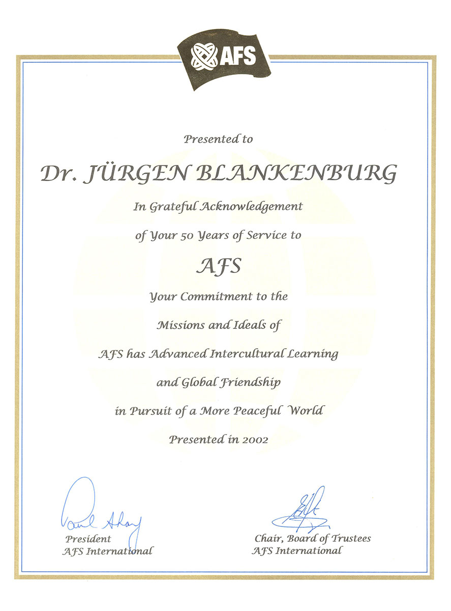 Jürgen Blankenburg war ein AFSer durch und durch – ein AFS-Austauschschüler von Duisburg nach Birmingham, Alabama, im Jahr 1952/53, eine Schlüsselfigur in AFS Deutschland während mehr als 25 Jahren, AFS Trustee in New York von 1993 bis 2000, damals auch Vorsitzender des Finanzausschusses, und Mitglied des Ausschusses für Risikomanagement bis 2004.