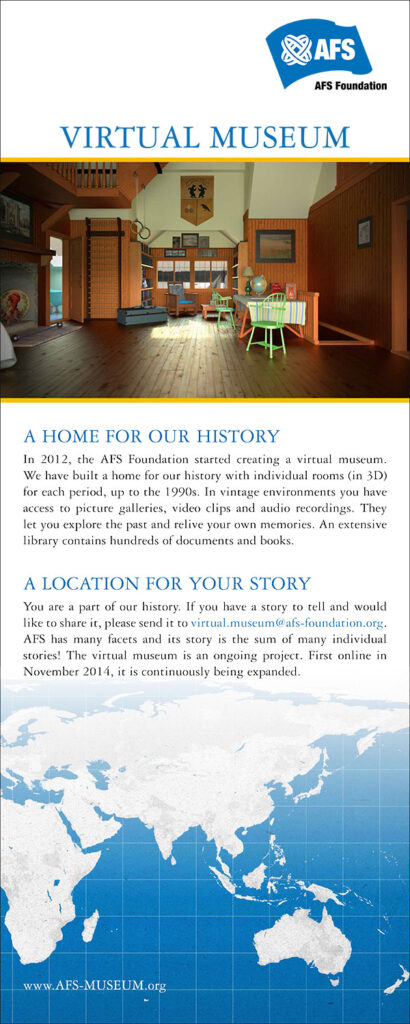 In 2012, the AFS Foundation started creating a virtual museum. We built a home for our history with individual rooms (in 3D) for each period, up to the1990s. In vintage environments you have access to picture galleries, video clips and audio recordings. The AFS Story lets you explore the past and relive your own memories.